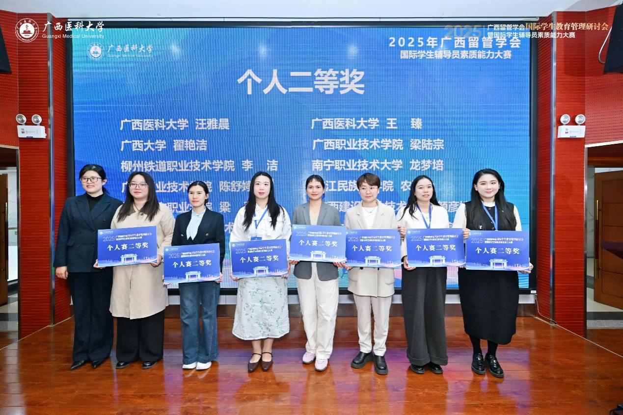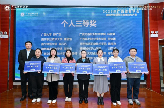 2025年11月24日至26日,由广西高等教育学会外国留学生教育管理专业委员会主办,广西医科大学承办的2025年国际学生教育管理研讨会暨国际学生辅导员素质能力大赛在广西医科大学成功举办,共有来自全区各高校的40多名国际学生辅导员参赛。我校辅导员组成代表队参赛并获佳绩。